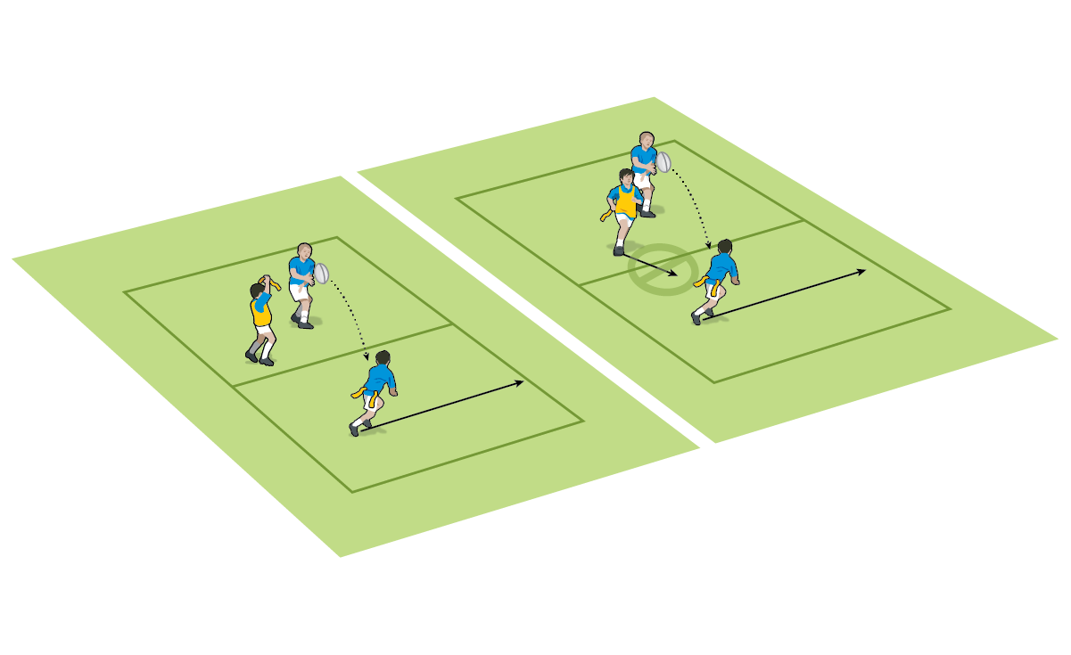 The attacking player needs to beat the defender. If they can’t, they can pass the ball to their support player. This activity works on evasive skills, creating space, support and continuity.