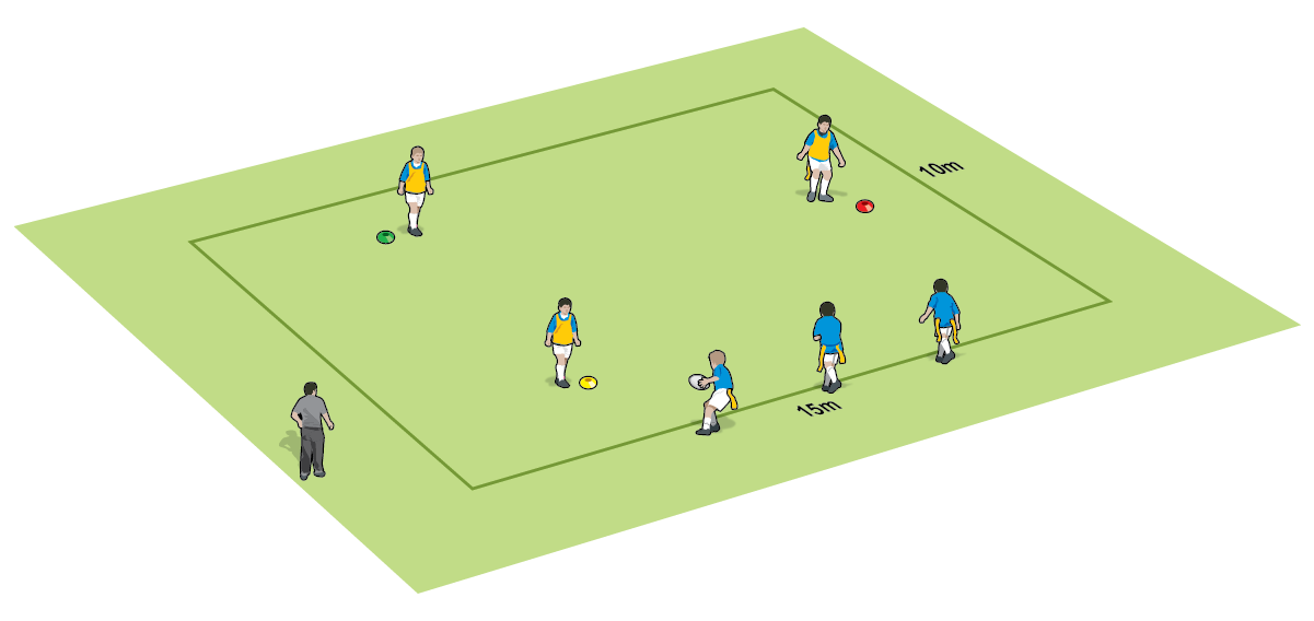 A 15m by 10m box (adjust accordingly). Three different coloured cones.