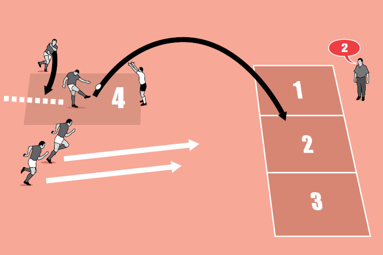 Mark out four boxes, as shown in the middle picture, with one defender at the end of box 4. A kicker runs into this box, receives a pass and kicks to one of the boxes (1-3) that you indicate.