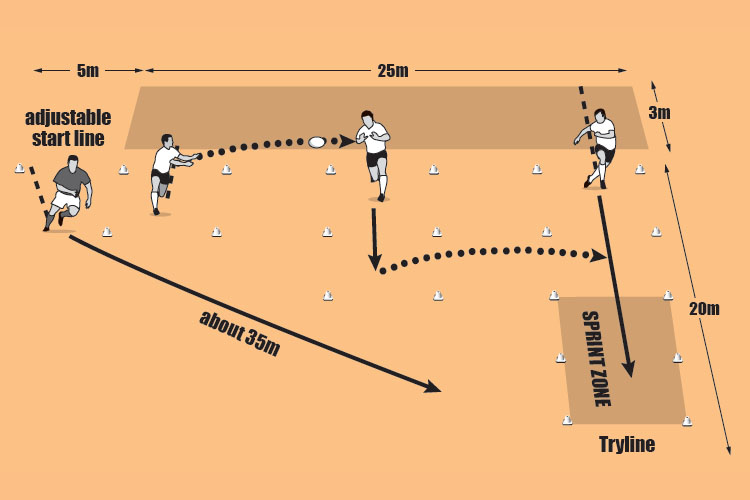 At the same time, set off a defender who tries to intercept (and touch) the final ball carrier before he makes the try line. He runs at an angle across the area. Adjust this distance to challenge your players (see picture 2).