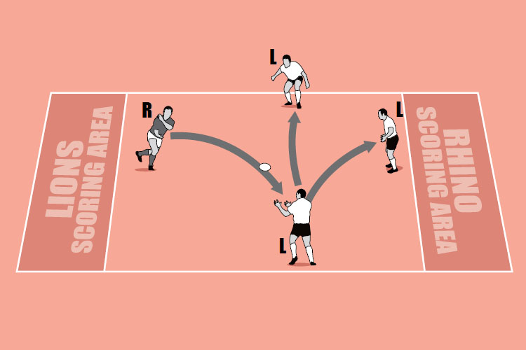 Set up four players as in the top picture. The rhino (R) and the lions (L) pass the ball amongst themselves. Shout “GO” and the player in possession of the ball aims for the try line. If the player with the ball is a lion, the other lions support him. Use full tackling, and stop if there is an infringement or a tackle is completed. Let the rhino have three attempts then rotate the players.