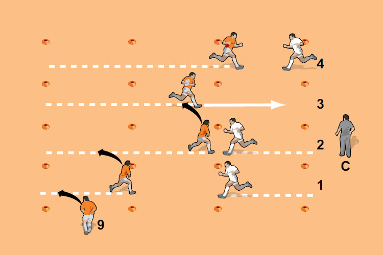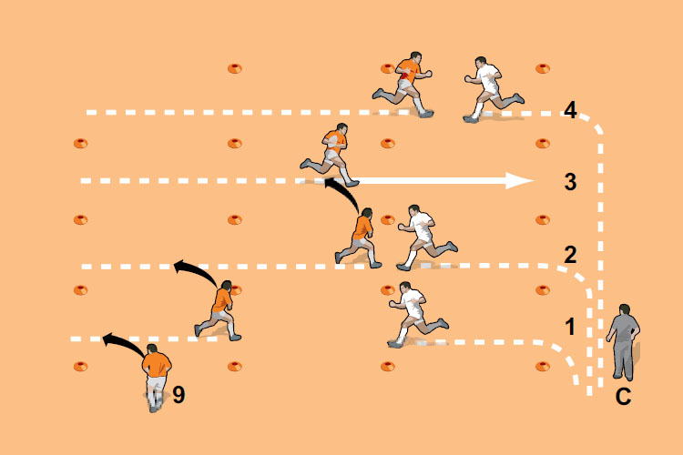 You might ask one defender to rush up while the others hold back, or one defender to walk or simply stop. The attacking players have to identify and exploit the weakness.