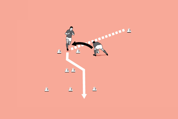 The ball carrier receives the ball on an angle, cuts sharply and then steps through the cones.