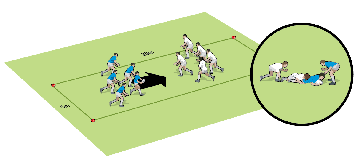 WHOLE: Play 5v5 in a narrow but long pitch. Rucks and mauls may involve only the tackler, ball carrier plus one from each side. Following a breakdown there is maximum one pass. Teams advance through recycling to score tries. Turnover the ball for infringements.