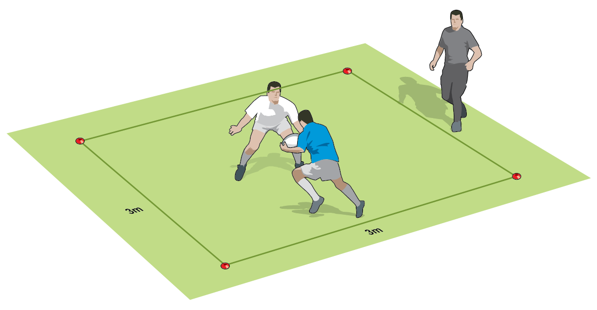 PART: Remove one player from each side to a separate area. Work with both players on their contact skills, with players taking it in turns in a 3m square to beat their opponent. Rotate players every couple of minutes, keeping them fresh and the game intensity high.
