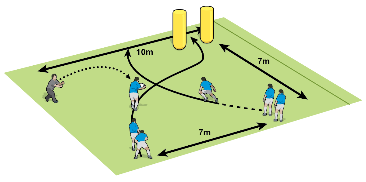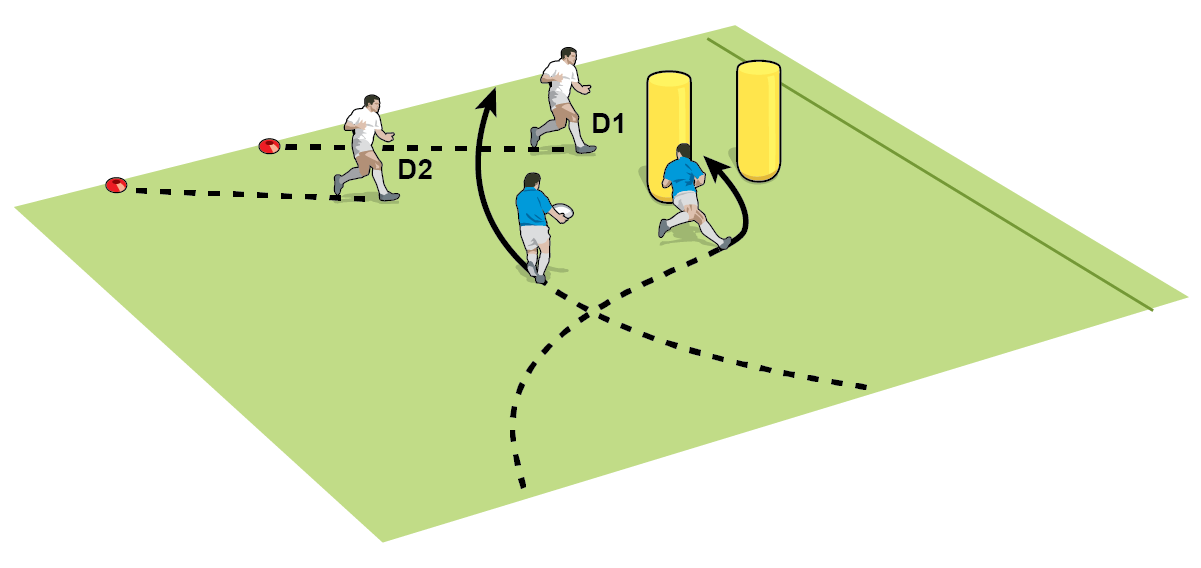 Develop by adding in two defenders, which means the second ball carrier has to run away from the covering player