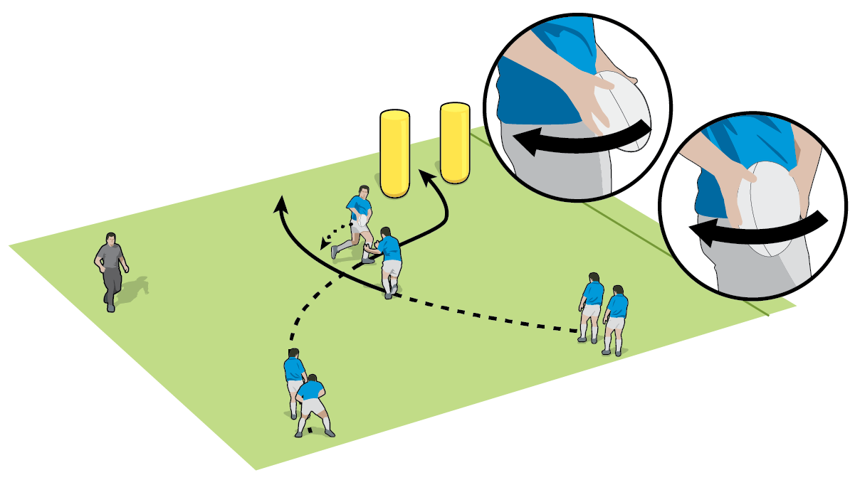 The initial ball carrier runs through the tackle tubes to be ready to take a return pass
