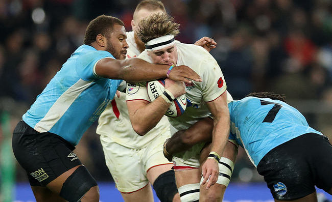 Now, look at the picture of Alex Coles. He has taken on the two defenders, yet has managed to use his evasion skills to get beyond the tackle line. He’s facing up the pitch, so can use his leg drive to gain even more advantages.