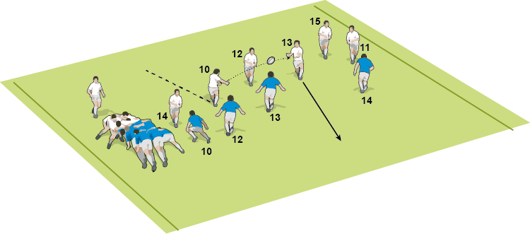 They can then release 13 with a long pass, or 12 if their 13 moves out to defend. If the defending 12 does go out to mark their opposite number, then your 10 attacks their 10 and passes to the blindside winger coming into the line, or 12 coming back on the angle.