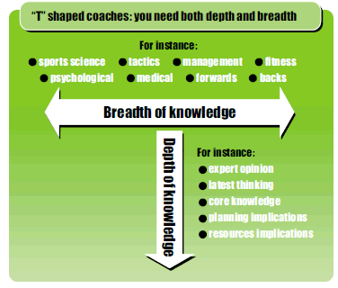 The head coach needs to have both a breadth and a depth of knowledge. Those with a breadth of knowledge, as indicated by the horizontal part of the "T" in the diagram, have a good understanding of all the specialist areas, but may not be specialists themselves.