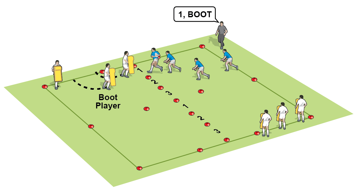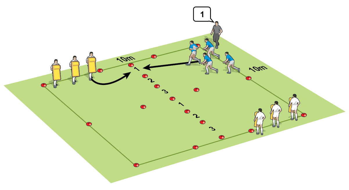 A 10m square divided into four, six ruck pads, a ball, coned gates numbered 1-3.