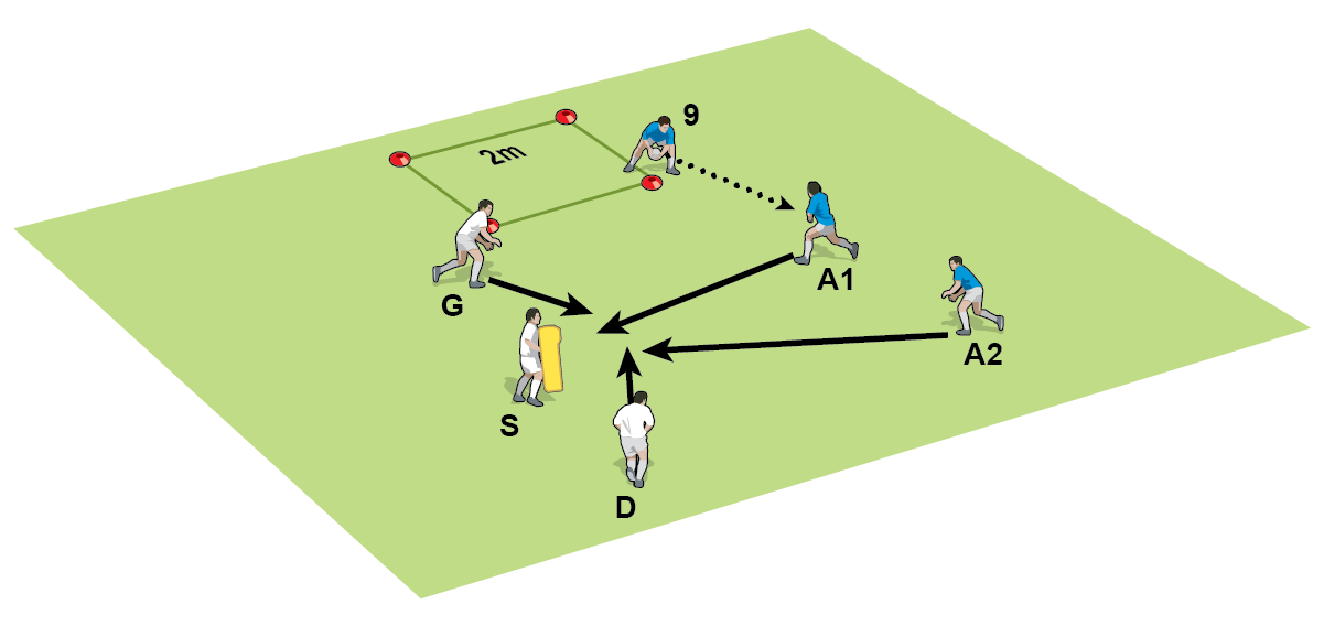 A 5m square (then a 2m square), a ball, four cones and a ruck pad.
