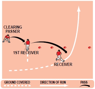Two players run forward as the “decoy wall”, with the ball being passed behind them to a deeper receiver on an outward arcing run outside the defence.