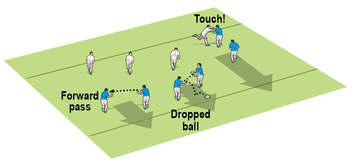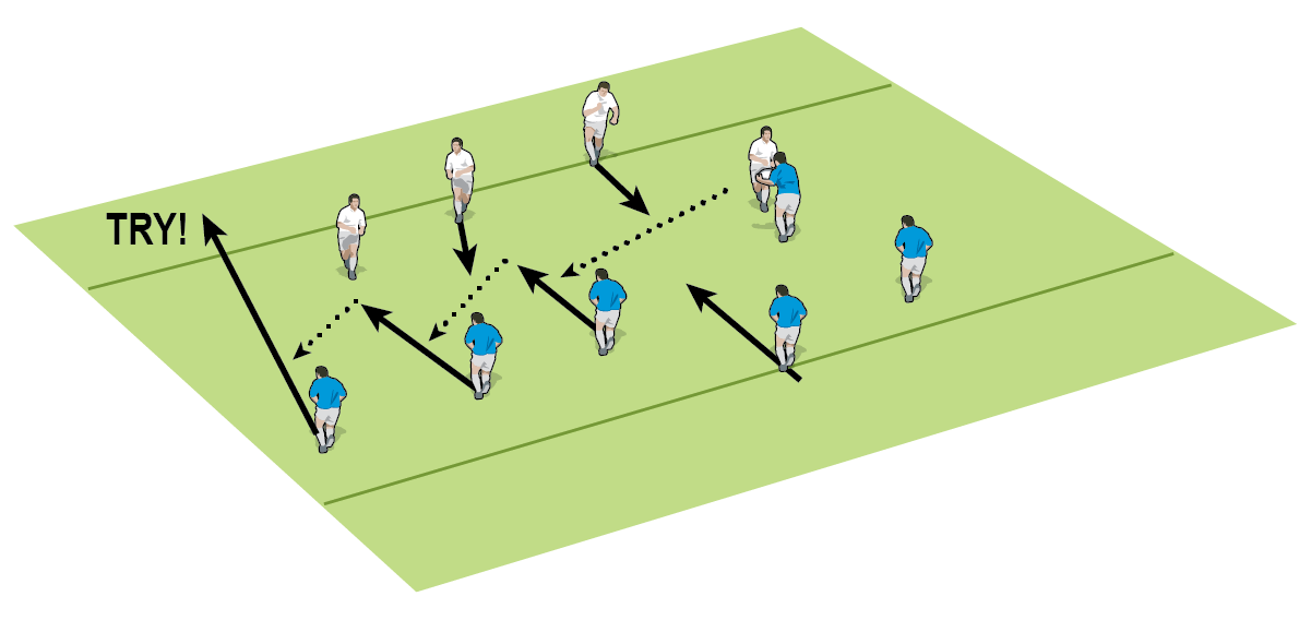 Work on quick attacking skills in a short but wide area. Despite the short distance to the try line, the attacking team will need to put pace onto the ball to score more often.