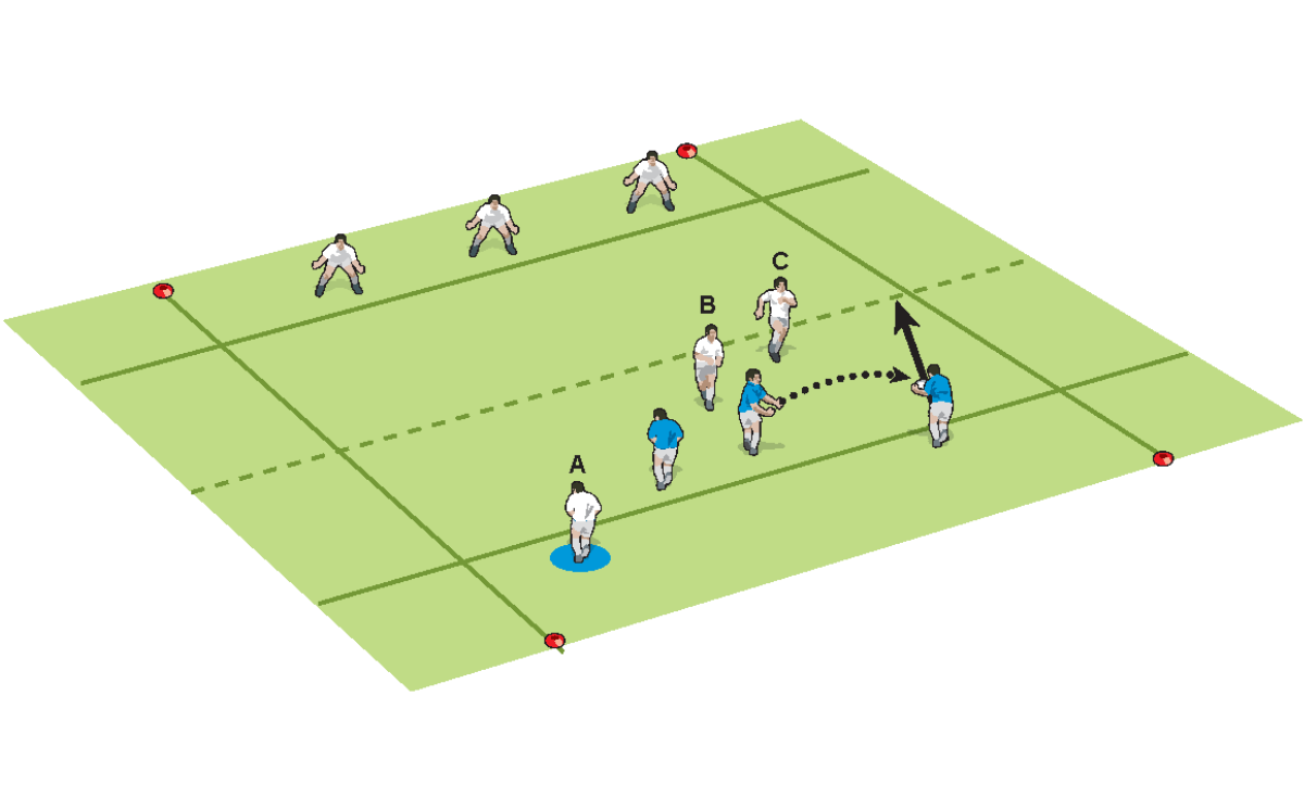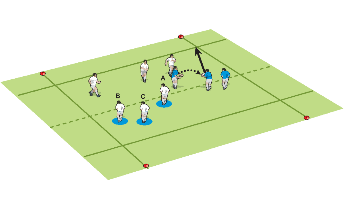 Activity: Put one defender (A) on the 22m line, two (B and C) on the 10m line, and three on the halfway line. Three attackers start 10m from the 22m line. They aim to get the ball past defender A (see top illustration). Once the ball carrier has crossed the 22m line, defender A becomes an attacker, and B and C come forward (see middle illustration). Once B and C are beaten, they join the attack and the final three defenders come forward (see bottom illustration). Use full tackling, and allow mini rucks and offloads out of the tackle. If the attack fails to beat the A, B and C defenders, those attackers becoming defenders A, B and C. The original A, B and C defenders become attackers. If the attack fails to beat the last row of defenders, the attackers becoming defenders A, B and C. The back row become the attackers and the original A, B and C defenders go to the back. Run for five minutes, then switch attack and defence.