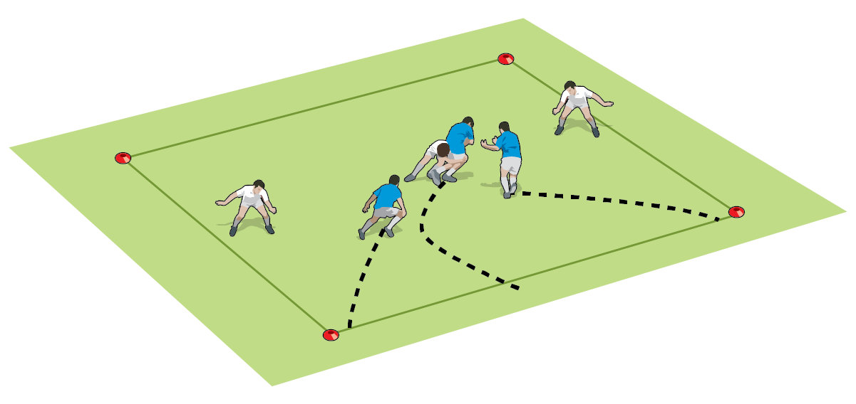 Encourage your players to attack the spaces between opponents with neat footwork and then offload the ball to team mates who are in close support.
