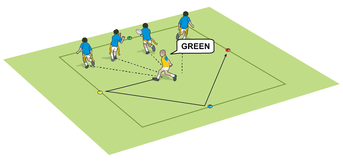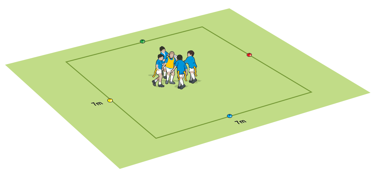A 7m box, though the dimensions change to suit your players. A ball and four different coloured cones.