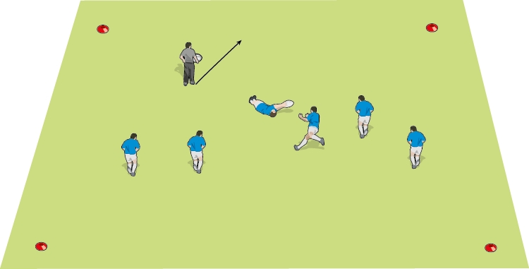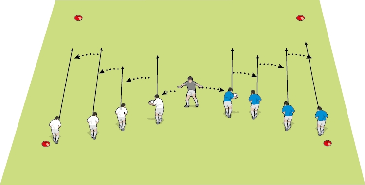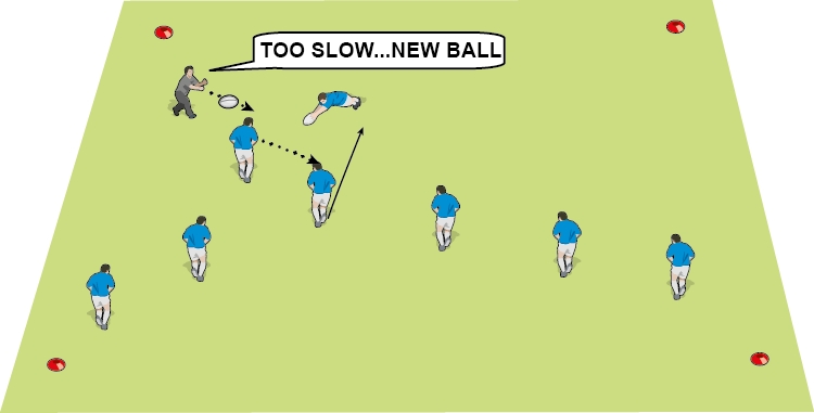 Activity: Split your players into groups of about eight, including a scrum-half. Each group takes it in turn to attack the far side of the box, initially unopposed and at full speed. You control the attack by calling “Tackle!” at various points. You carry two spare balls and give the 9 one of them if you feel the ball in play is not being presented or recycled quickly enough. The aim is to get each group playing a lot faster than they normally would.