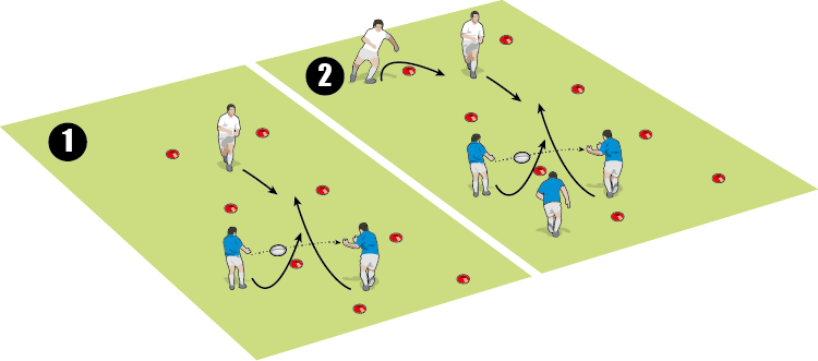 The support player has several roles in the game, all of which go back to the main attacking principles of rugby: go forward and continuity. We need to help the players decide what role and actions would be best in each situation. Here are three progressive exercises that help develop good habits.