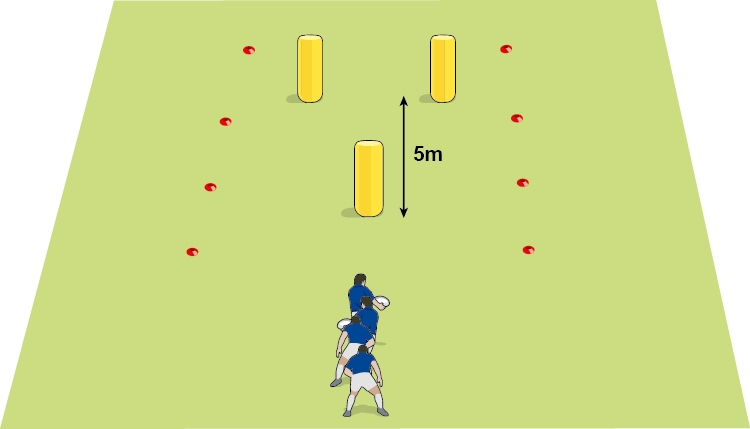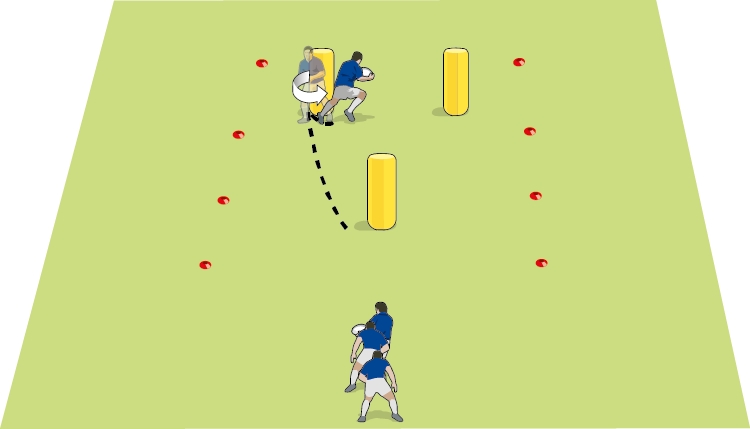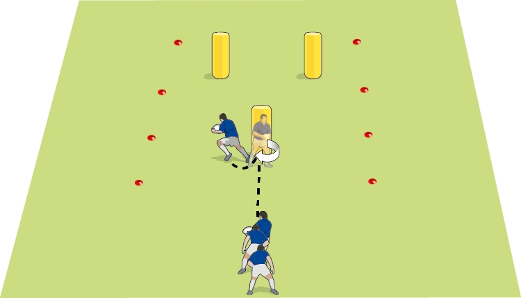 Use a 10m square, with three tackle tubes 5m apart (as per the top illustration). You can use ruck pads, a static player or a circle of cones. Four balls are needed.