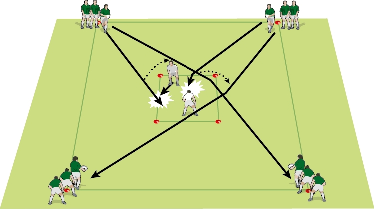 Warm-up: An even number of players start on each side of the 10m square and jog across it. When they reach the opposite side, they turn and jog back. They continue shuttling back and forth, trying to avoid contact. Gradually increase the speed they run at, until they are at a full-speed sprint.