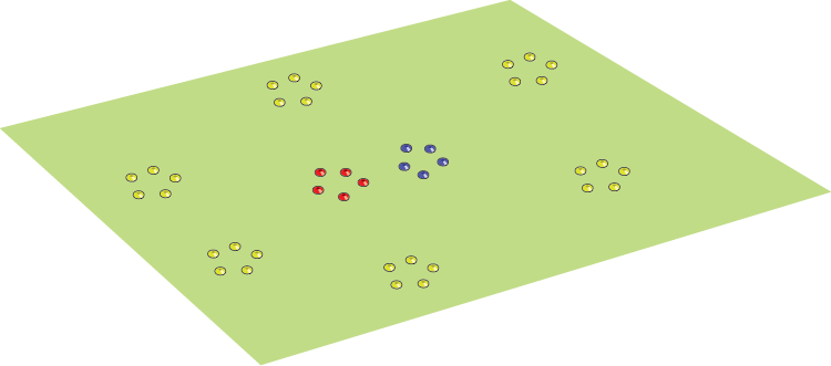 Using half the pitch, make 9 circles on the ground with cones, 7 yellow, 1 red and 1 blue. Can use hula hoops instead.