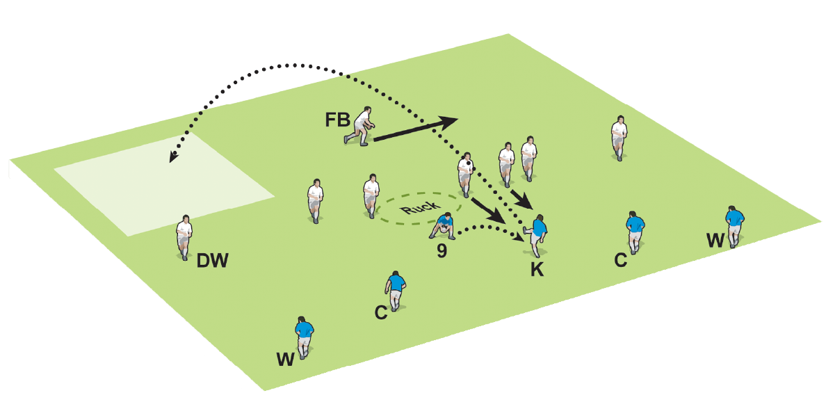 See picture 1: From a ruck near the middle of the pitch, the defensive full back (FB) tends to line up in the backfield opposite the kicker (K).
