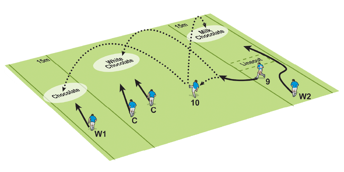 However, they can also kick with the outside of their boot back over into the space behind the lineout (“milk chocolate”). The blindside winger (W2) races around the front of the lineout to take the ball as quite often the defending winger covers across and is out of position.