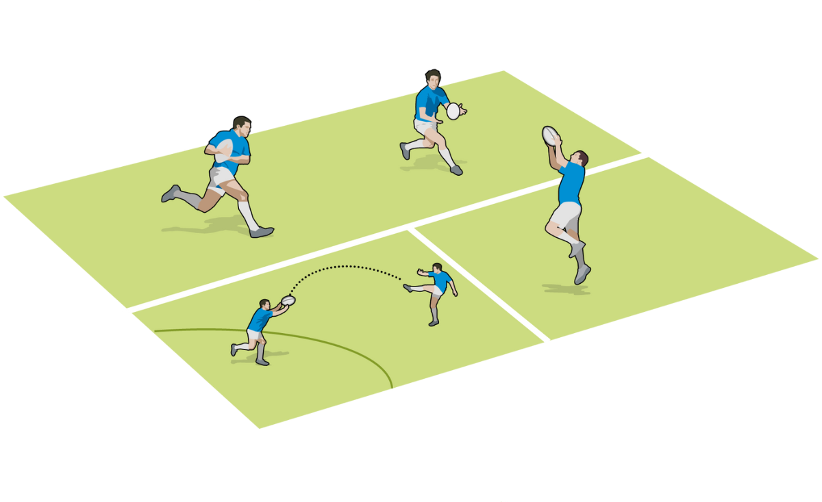 Emphasise movement to find space to kick and to take the ball. This should develop players’ cross-kicking, chip-kicking and catching skills to score tries.