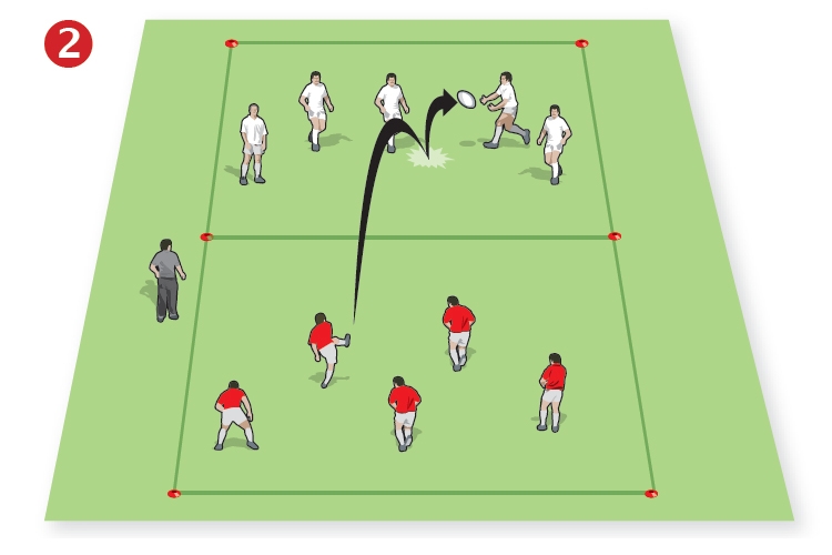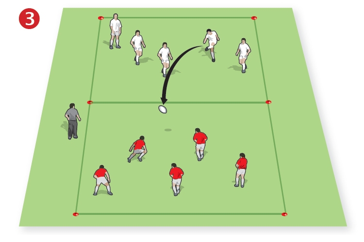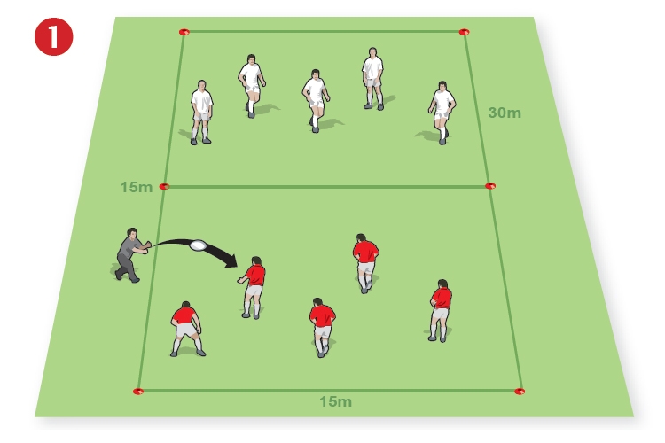 Activity: Place four attackers in single file at the opposite end of the area from the try line; and three defenders, also in single file, in the middle of the 5m line, facing away from the attackers. You stand outside the area; on your whistle, pass the ball to the lead attacker, who heads for the try line, flanked by the other attackers, who should spread out in support. As the attackers move forwards, the defenders must turn and defend against the attackers, trying to prevent them from going over for a try. Play two-handed touch rugby. Each game ends when either a try is scored, the defenders take possession, or the player in possession is tackled.