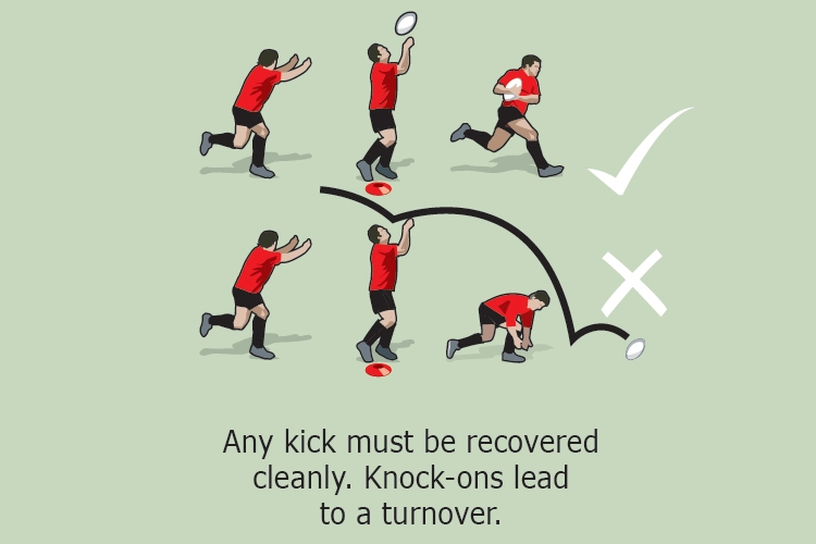 Activity: Play any version of rugby, including touch. After three tackles, the ball can be kicked. If it is not kicked before the fifth tackle, it is turned over. If the ball is kicked, it must be gathered cleanly first time, or the ball is turned over. Don’t allow knock-ons or knock-backs. The ball is allowed to touch the ground. Don’t allow the players to contest for it on the ground. Any kick can be contested, but if the kicking side recovers the ball, don’t get any extra tackles. Score one point for each try.