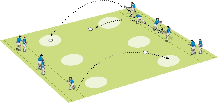 This is a practice for accuracy - and by creating a circle you can change the emphasis onto the weight of the kick by asking the kicker to try and land the ball in it.