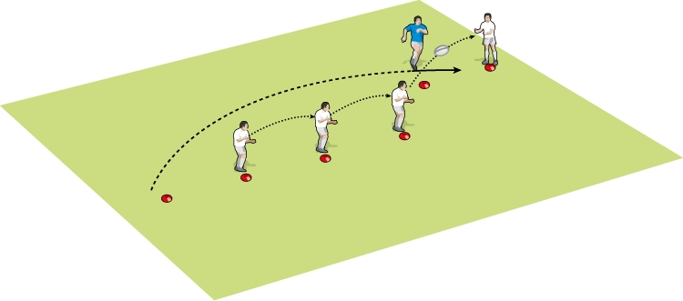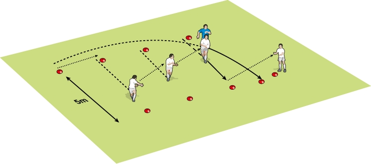 ACTIVITY: Set up as in the first illustration. Though the players here are 2m apart, adjust the distances to suit your players. The ‘runner’ starts by passing to the first player in the line. They then sprint around the back and towards the gate inside the final receiver. The runner aims to get through this gate before the last pass is made to intercept the pass (see the middle illustration). Meanwhile, the other players pass the ball along the line, aiming for the ball to reach the end receiver before the runner gets around to the last gate.