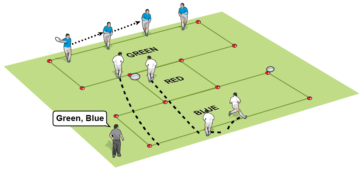 Develop good passing and calling habits by working in two different widths. Players have to adjust their running lines and their passing strengths.