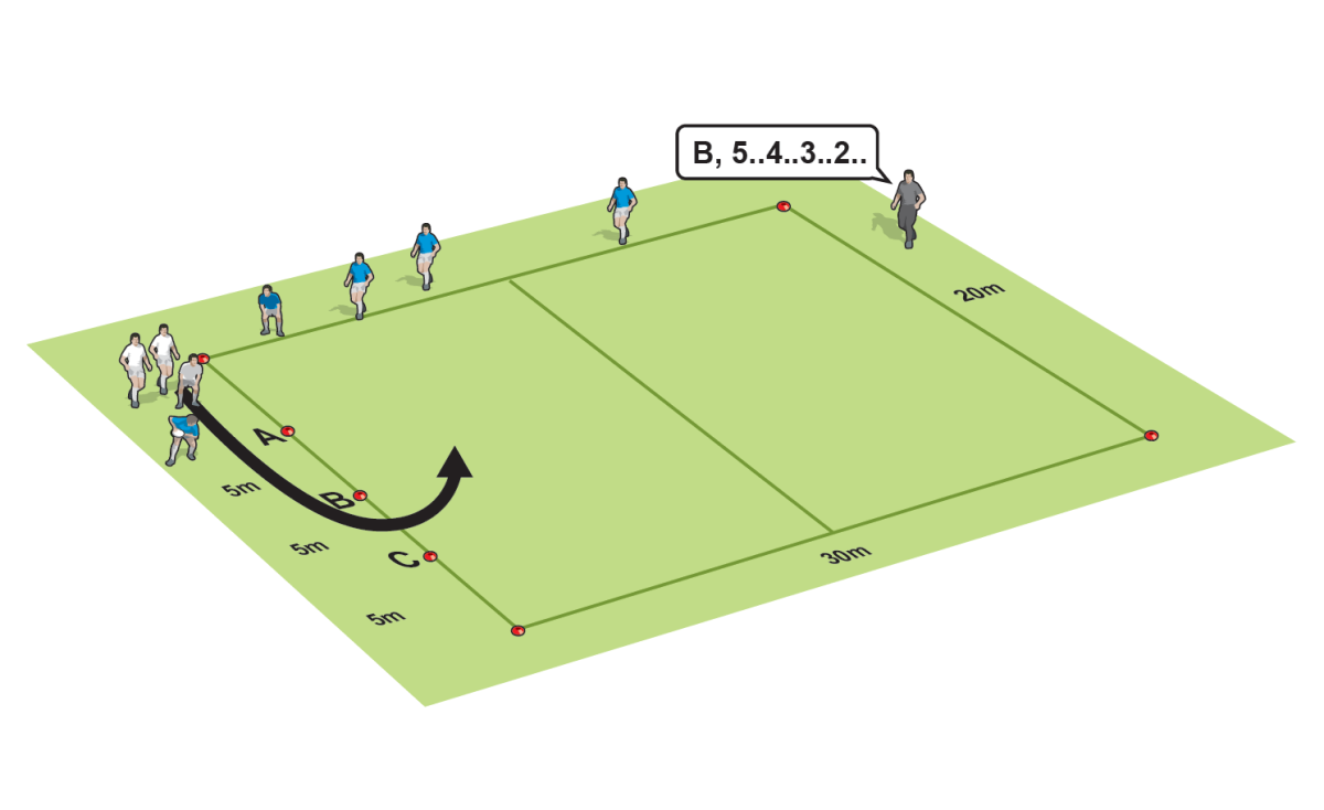 GAME SITUATION: Put four attackers at one end of the box with three in one half and one in the other. Put a feeder about 5m outside the box, around 5m up. Shout out a letter, then countdown from five. Three defenders run around the lettered cone. Using touch or full tackling, the attack has to score at the far end once they receive the ball after the countdown.