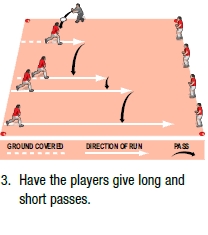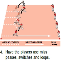 This drill involves four players running across an area, passing a ball. At the far side, they hand the ball to a waiting four, who do exactly the same in the opposite direction. Once you are happy with their techniques, build up the steps.