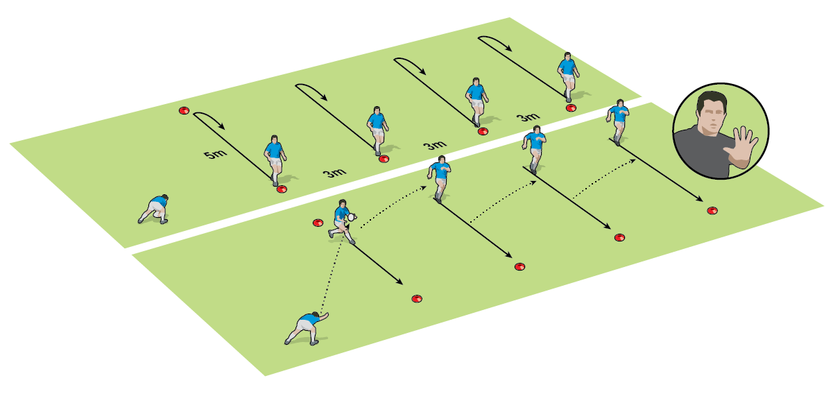 Pass the ball down the line quickly while attacking the ball at pace. Instead of the players stretching for the ball, the catcher spreads the fingers of their farthest hand like a spider. The players will catch better, move faster and pass quicker.