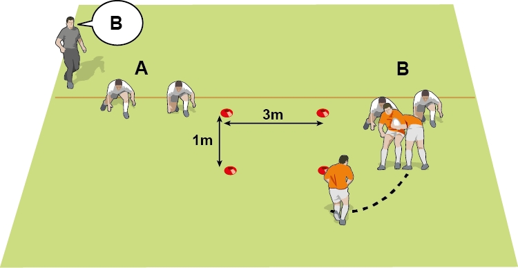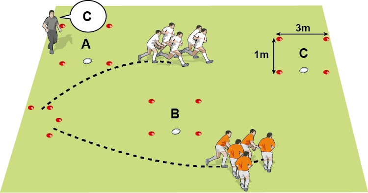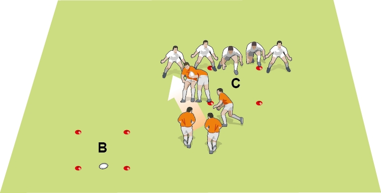 Development: Set up a 5v5 at the side of a playing area, containing three ‘rucks’ – A, B and C. Place a ball at each ruck. Call out a letter at which the teams can position themselves. The attack decides on which side of the ruck to attack. It is not allowed to pass the ball. Play full-contact rugby.