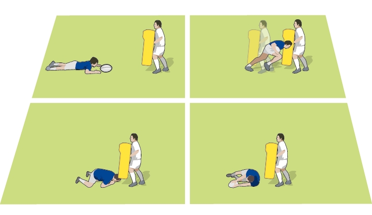The ball carrier starts on their front, with a ruck pad-holder about 3m away