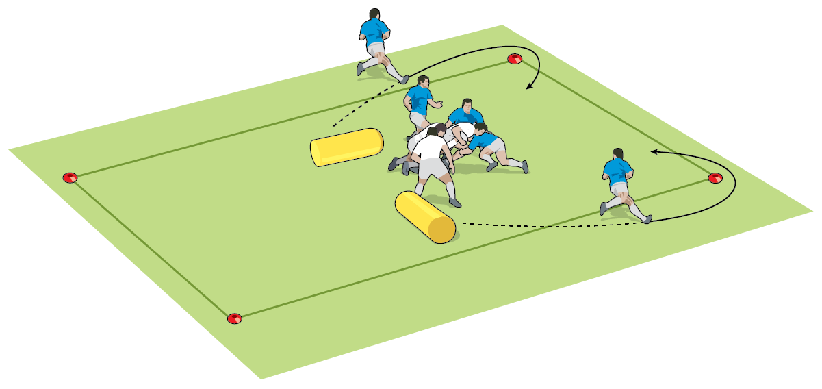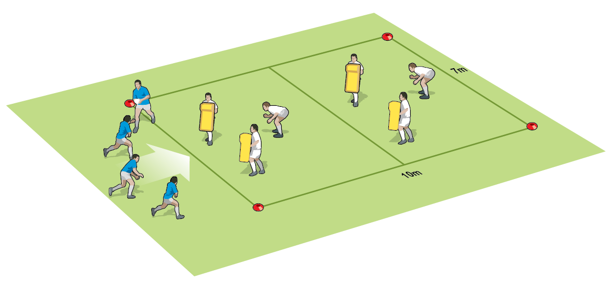 Not all mauls are set up from lineouts. Sometimes a player stays on their feet through the first contact and is then held up. They should choose whether to drive on with support, or go to ground. This session works on staying on the feet.