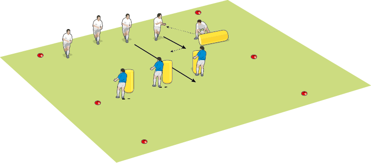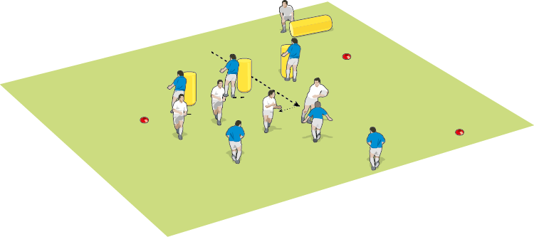 This replicates a game situation where there is plenty of unwanted traffic once a break has been made. You can run the exercise in two stages, with the players getting used to spotting a gap in the first stage. The second stage adds another decision.