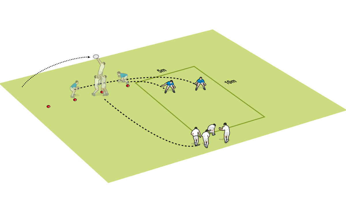 Activity: Two defenders start on two of the five cones spread along the potential length of the lineout. A lineout pod, plus one player, move to the lineout and position themselves opposite a free cone. The ball is thrown in.