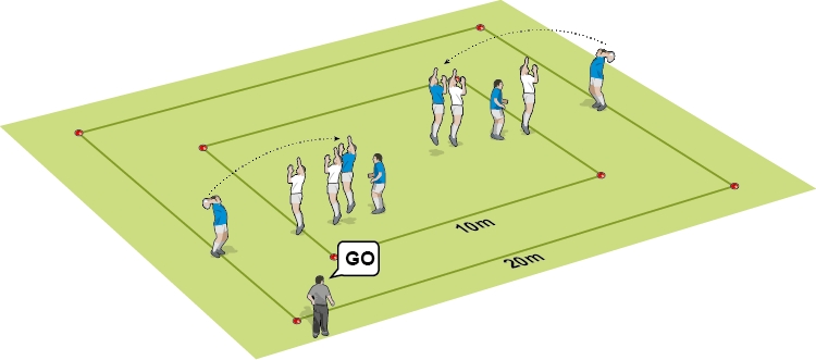 GAME: Put two pairs of jumpers in the middle of the box. Each pair has its own thrower and is marked by one defender. Two defenders run around the outside of the 10m box. When you shout “Go!”, each thrower has five seconds to find their jumper. The perimeter defender runs in front of their hooker but can’t jump to defend. The ball must be caught in the air to count.