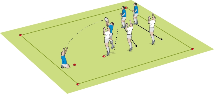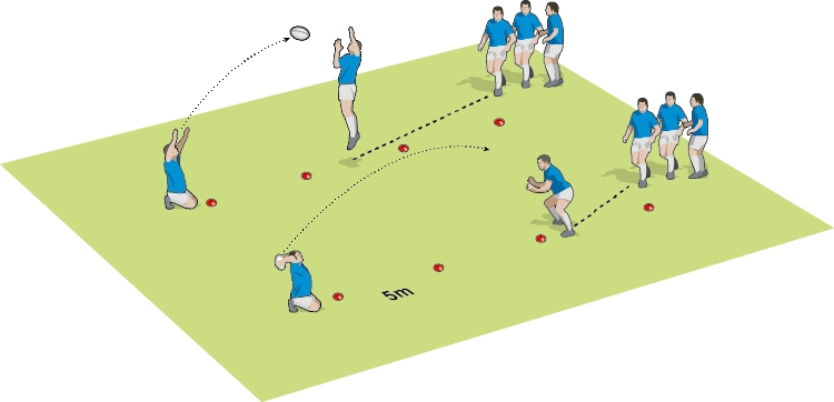 ACTIVITY: Place a thrower on their knees on the touchline. Line up your jumpers at the side of the normal lineout jumping area, opposite the 5m line. The first player enters the lineout area and jumps to meet a throw.