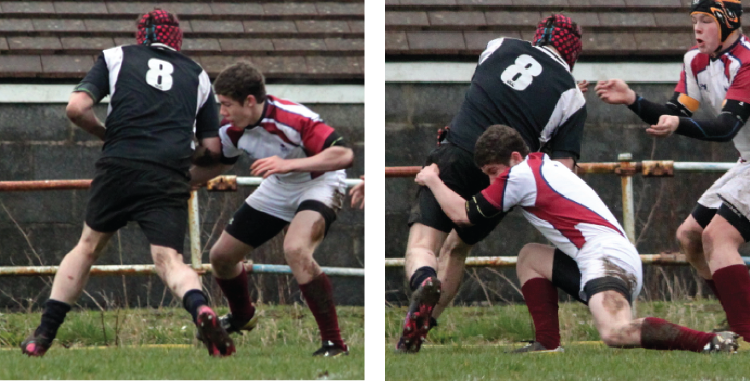 Players repeat the exercise but from the point of view of slightly different scenarios. Repetition without repetition is a good way to give players a better understanding of the decision-making processes in a tackle, such as where to put the foot; when to dip; when to engage; and how hard to grip.