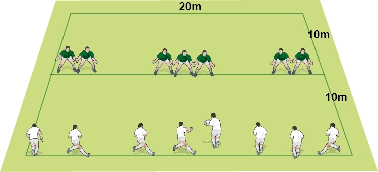 The attacking team aims to score at the far end, within a set number of touches, decided by you. If they are touched, the ball carrier puts the ball on the ground and another player passes it.