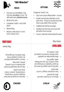 - Game constraints (low load), game constraints (medium load). Start with the game, but give the All Blacks two or three phases to score. Or, take players from one team and add to the other, to create different overloads, depending on who scores. Or reward the All Blacks that scores with an extra phase in the next round.