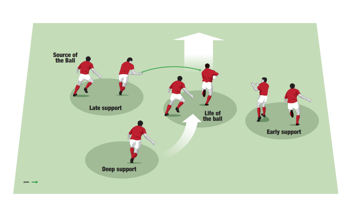 Once a player knows their position relative to the ball, they will belong to one of four ’families’ - ’life of the ball players’; ’early players’, ’late support players’ and ’players in deep support’.