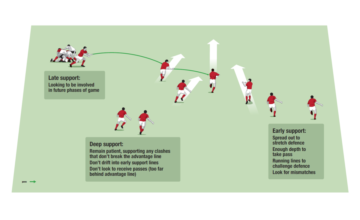 Understand the position of support players in relation to the ball to help break the advantage line. By Jean Bidal, coaching guru for the FFR and the IRB.