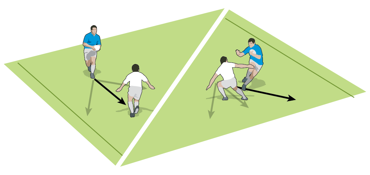 Get defenders off balance and less effective by making them commit to one tackling line while attacking another. You can do this by varying your angle of attack.